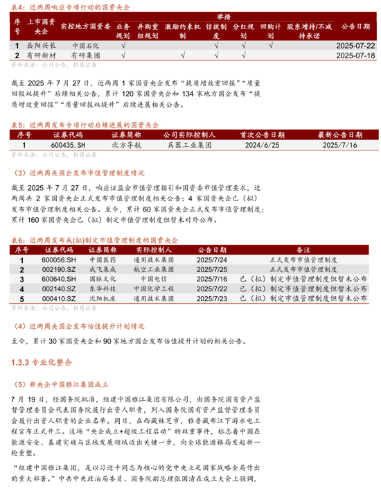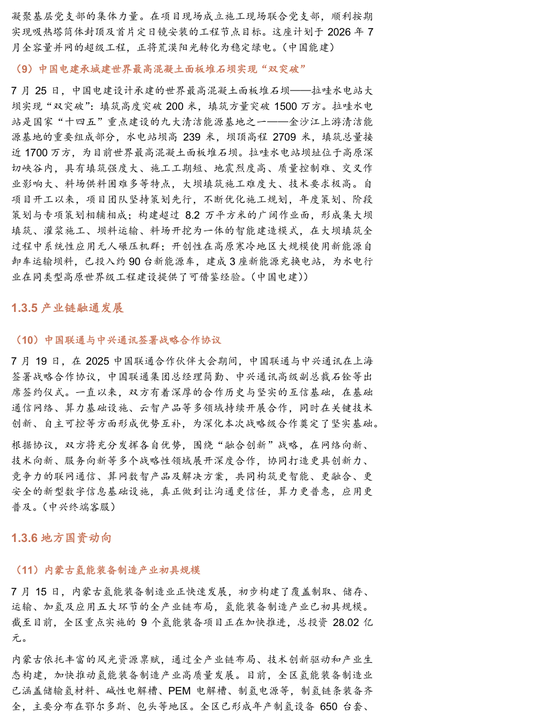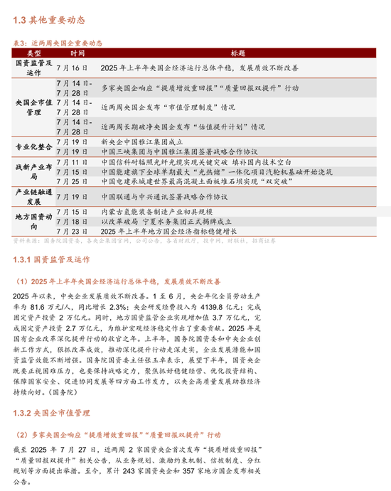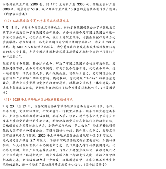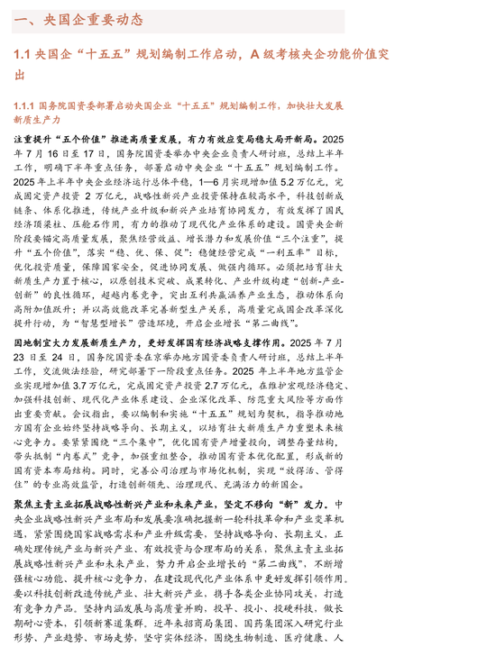 2025年7月16日至17日、23日至24日,国务院国资委分别举办中央企业、地方国资委负责人研讨班,总结上半年工作,明确下半年重点任务,并部署启动央国企“十五五”规划编制工作。同时,2025年7月18日,国资委审议通过央企负责人考核结果,六成以上的A级企业担任产业链“链长”或牵头创新联合体建设,功能价值突出。